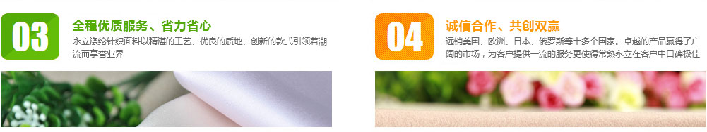 公司成立于1997年,坐落于風景秀麗的虞山腳下,位于中國經(jīng)濟最活躍的版圖--長江三角洲經(jīng)濟技術開發(fā)區(qū)的黃金地段上,常熟市永立針紡織有限公司,伴隨著中國針紡織品行業(yè)蓬勃發(fā)展,走過了10多年的創(chuàng)業(yè)歷程,如今已發(fā)展成為一家集工、貿(mào)于一身,在行業(yè)內(nèi)聞名遐邇的專業(yè)生產(chǎn)滌綸針織面料的特色企業(yè)。本公司擁有來自臺灣的先進制造設備,以雙面小提花機為主的34寸(16--45針)雙面緯編機50臺、34寸(20--50針)單面開幅機9臺、36寸 22針德國邁耶OVJE雙面電腦大提花機6臺及其他先進設備。憑借著一流的設備,以及“人無我有,人有我好,人好我轉”的經(jīng)營理念,常熟永立一直致力于滌綸面料的創(chuàng)新...